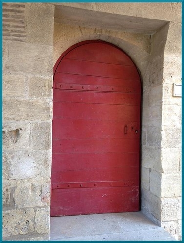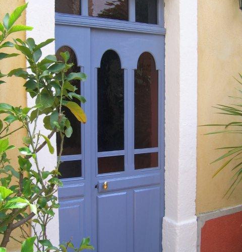Travaux de transformation d'une porte ancienne et pose de vitraux soufflets bouche en remplacement de panneaux bois.client: particulier Vendargues 2010.